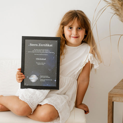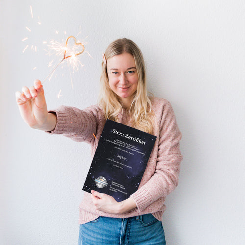 Du erhältst ein personalisiertes Sternzertifikat für den von dir getauften Stern. Wir bieten eine große Auswahl an verschiedenen Designs, sowie die Möglichkeit, eine persönliche Widmung hinzuzufügen.